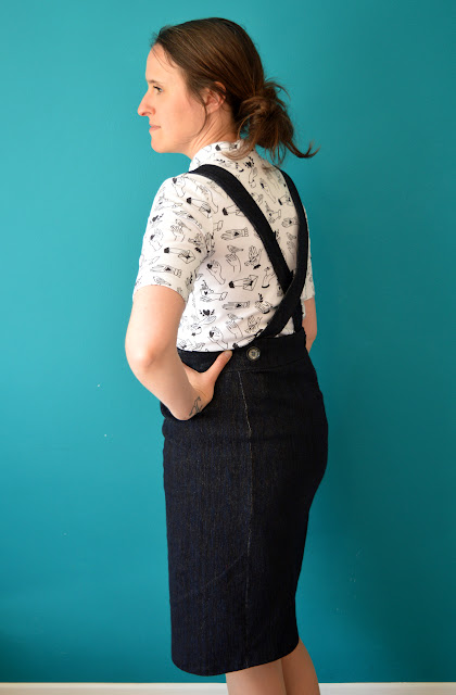 Like so many other sewers, it would seem (I just wrote 'seam' there at first!), I fell hard for the pinafore variation of the Bibi skirt pattern from Tilly's Stretch book. However, it wasn't on my 'sewing project priority' list until, A) MMMay made me face the fact that my previous denim-look stretch skirt had to go and, B) I was looking for a way to repurpose the fabric I salvaged from a recent failed project. A plan was born...