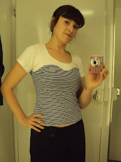 The most observant will have noticed this top paired with the red shorts from my last post. The super nice stripey fabric was bought in the summer sale of a fairly high end fabric shop, it was reduced from €16.95 a metre, to €2.95! After the sale, the price went right back up. Jeez, talk about mark up! Well, fresh from the triumph of this well fitting top, I cranked out a puff sleeved scoop-neck item from another striped fabric from the same source: