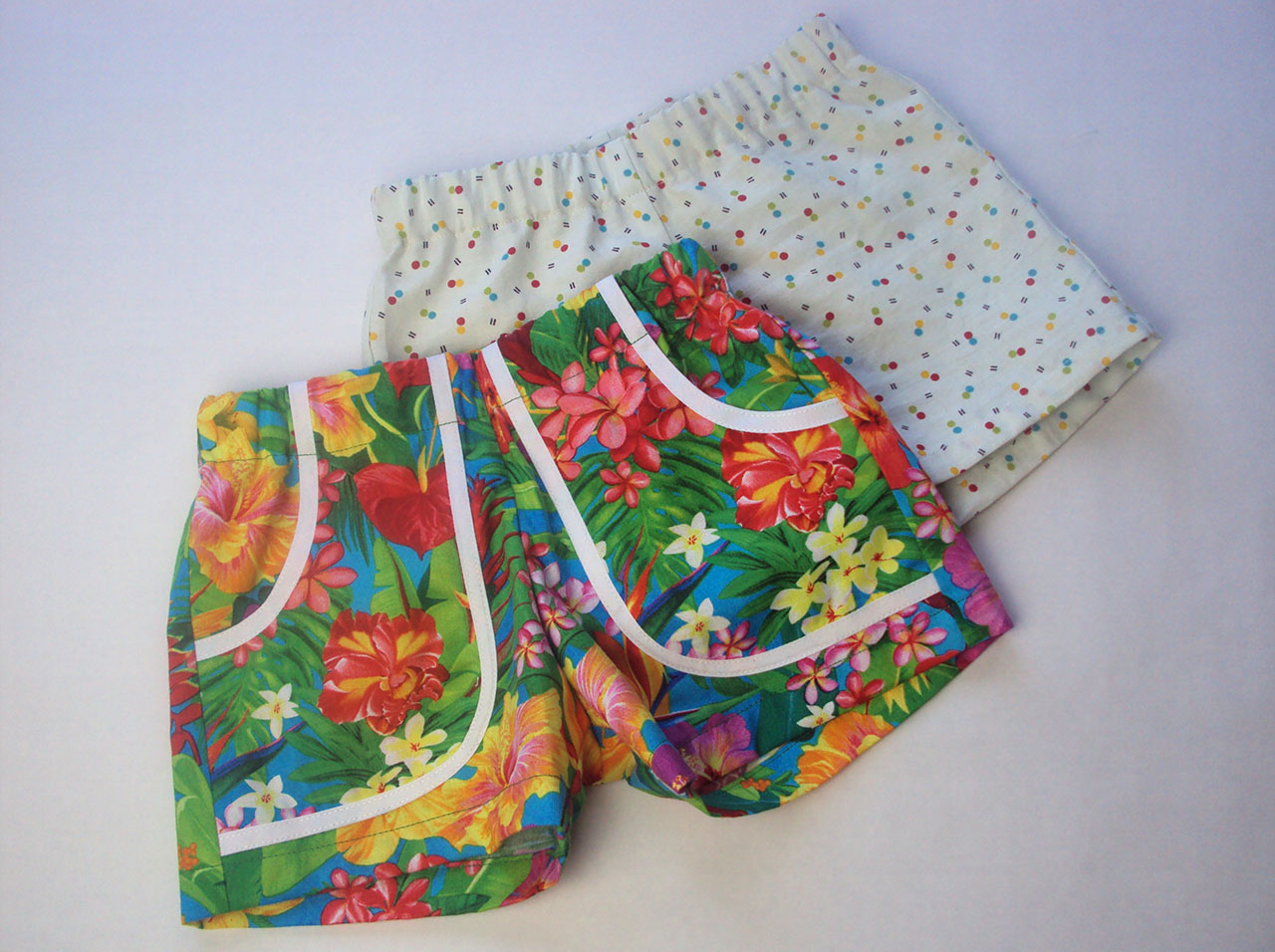 My goodness that's some pleasing alliteration, isn't it? Since I made the commitment to get to grips with my over-flowing scrap-and-small piece boxes, I've been having lots of fun using some lovely pieces of cotton to make super cute summer shorts for the scamp. But it hasn't stopped there. I've also been making them for other children as birthday gifts and bartering fodder. I've been sharing most of them via my Instagram feed, but these two pairs are my favourites.